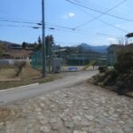 道路斜め反対にはコミュニティ広場があり、